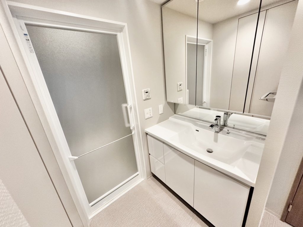 白で統一された清潔感のある洗面台と浴室です♪